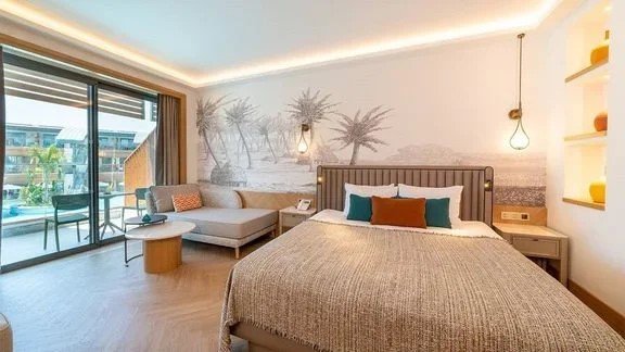 Kétágyas szoba medencekapcsolattal: A kényelmes, ízlésesen berendezett szoba egy hálószobával rendelkezik, amelyben egy franciaágy és egy egyszemélyes ágy található, legfeljebb három felnőtt elszállásolására alkalmas. A vendégek kényelmét légkondicionálás, zuhanyzó, hajszárító, papucs, fürdőszoba és külön WC biztosítja. A szoba felszereltségéhez tartozik LED televízió, telefon, minibár, tea- és kávéfőző készlet, széf, ingyenes Wi-Fi, erkély, valamint gőzvasaló és vasalódeszka.